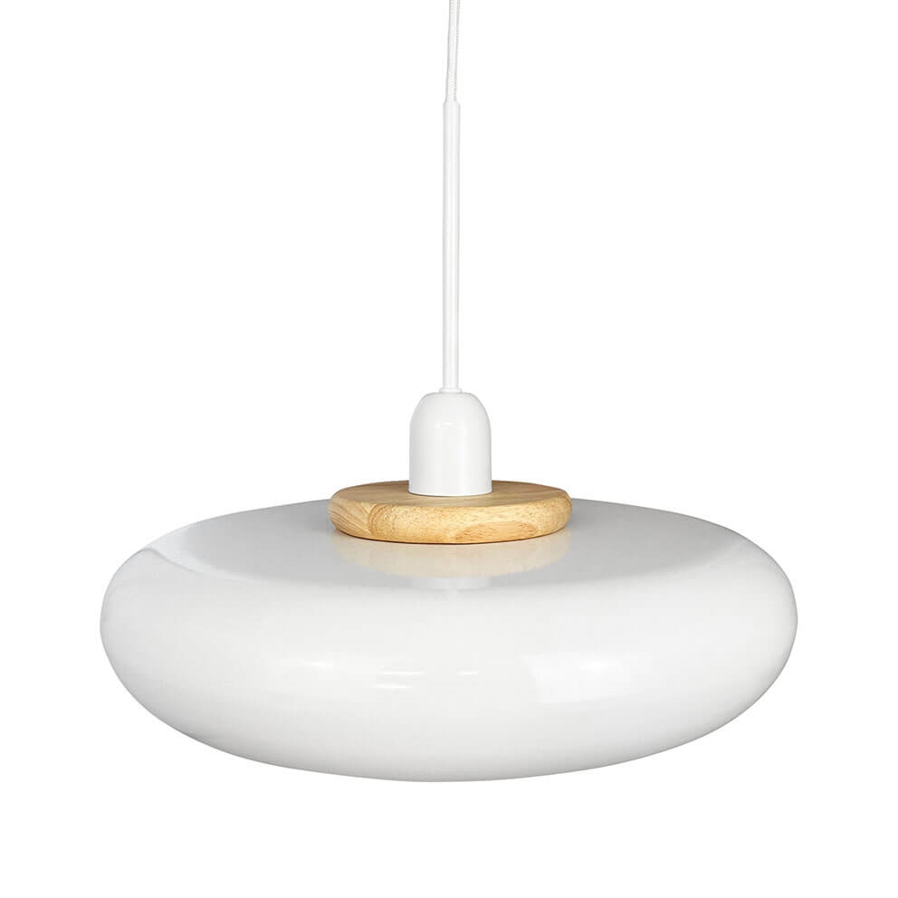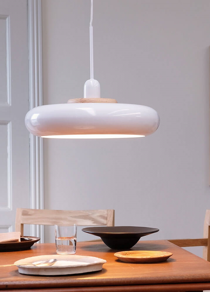 Dyberg Larsen Planet hanglamp, glanzend wit met lichte houten ring - ontworpen door Frank Kerdil