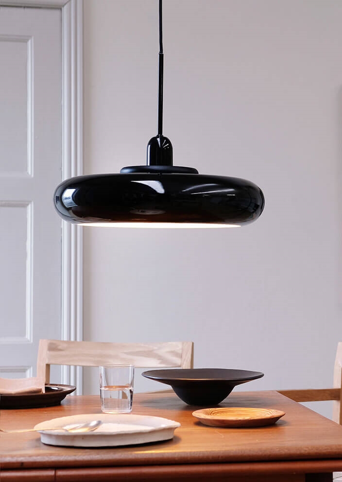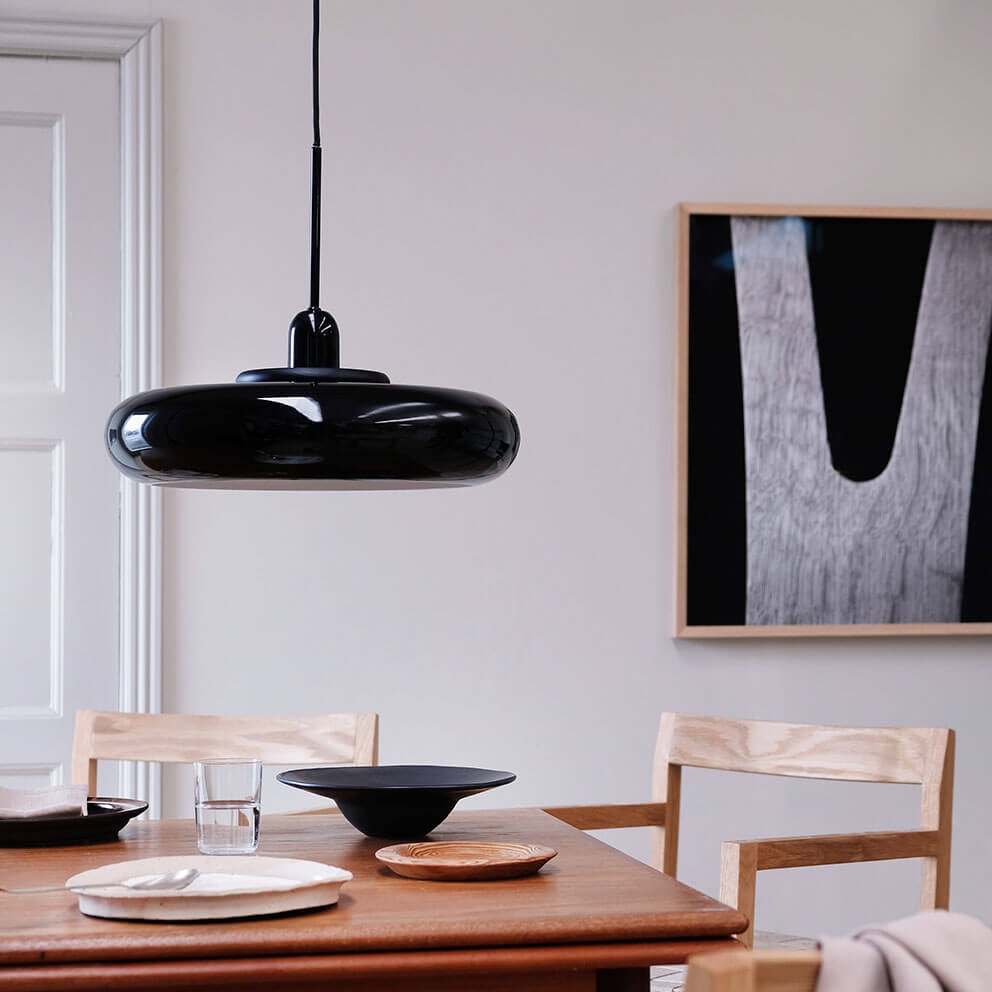 Dyberg Larsen Planet hanglamp, zwart met zwarte houten ring - ontworpen door Frank Kerdil