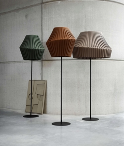 De lamp is verkrijgbaar als zowel vloerlamp als hanglamp met kappen in twee verschillende maten en vijf verschillende kleuren - off white, antraciet, deep green/groen, sand taupe en cinnamon brown/bruin.