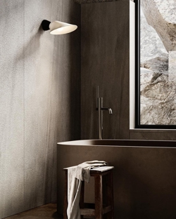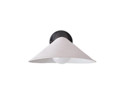 Plume wandlamp heeft een zwarte basis van aluminium en is verkrijgbaar in verschillende modellen – met een kap van polycarbonaat of porselein, en zowel met als zonder snoer en met of zonder schakelaar.