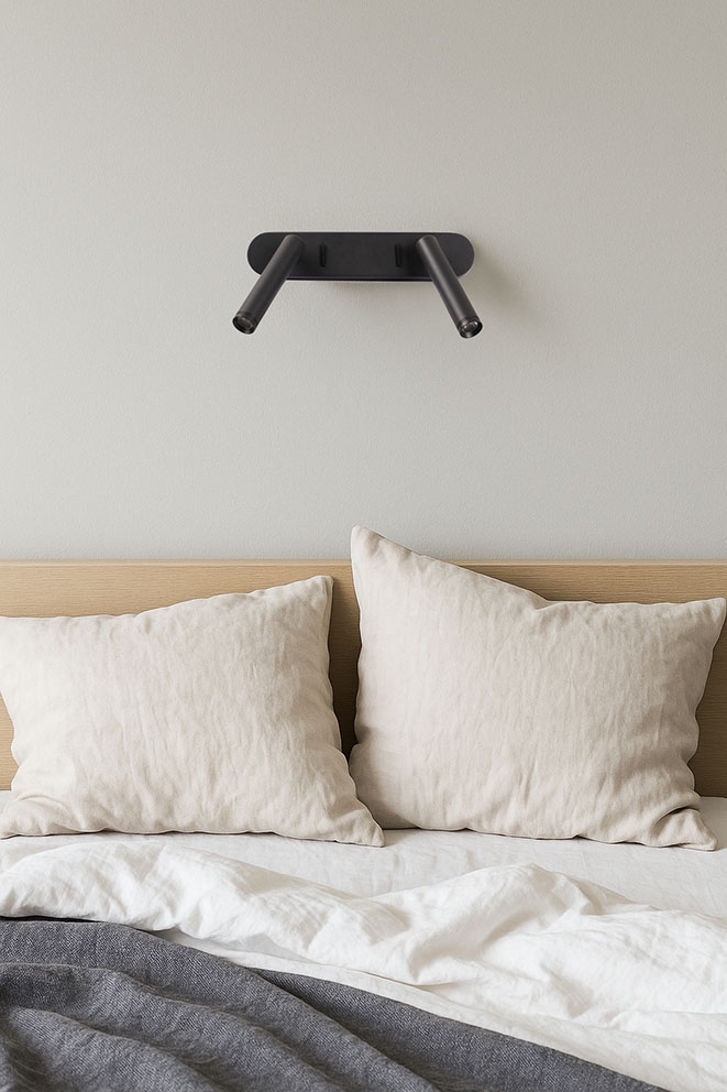 De wandlamp Point met twee slanke, verstelbare spots is flexibele en functionele verlichting met een strak en minimalistisch design. Ideaal als leeslicht naast het bed of als gericht werklicht in huis en in professionele omgevingen. Elk van de twee spots op de compacte wandlamp heeft een geïntegreerde LED-lichtbron met een warm en aangenaam licht en een eigen schakelaar, zodat je ze afzonderlijk aan en uit kunt zetten.