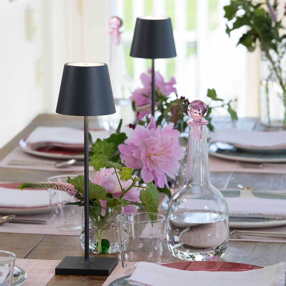 De draagbare tafellamp Poldina heeft een stijlvol design met een klassiek lampenkapje op een slanke lampensteel met een discrete basis. De lamp is ook verkrijgbaar in de kleinere uitvoeringen mini en micro.