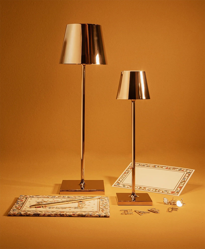 De lampenserie Poldina omvat onder andere tafellampen, vloerlampen en hanglampen met oplaadbare batterij.