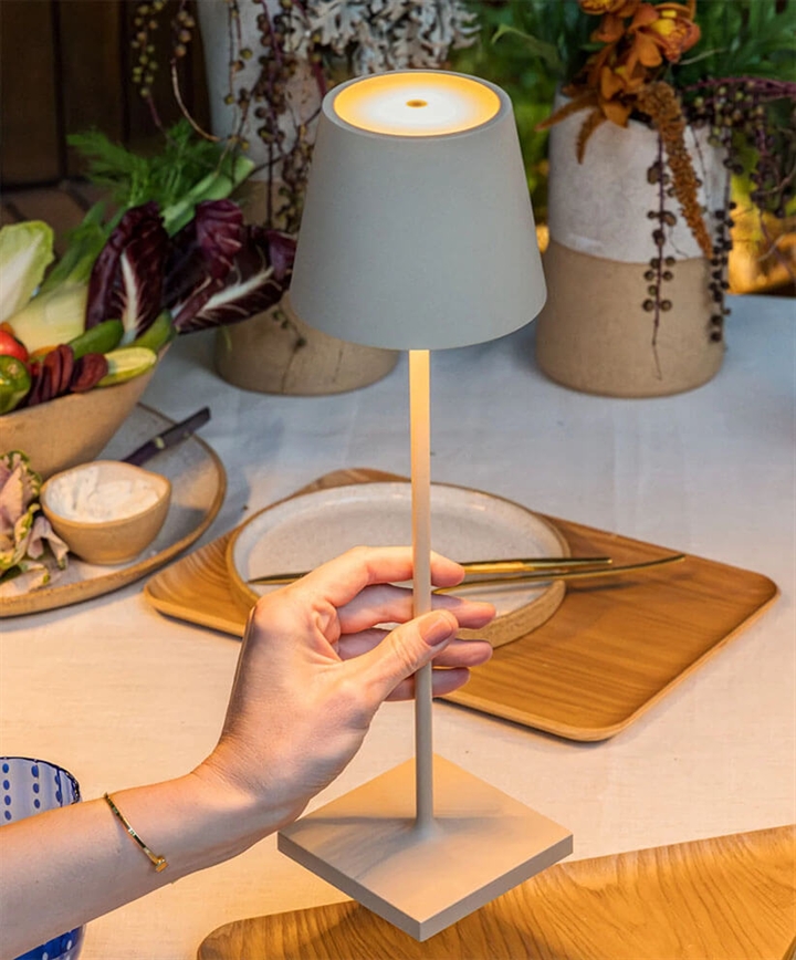 De tafellamp is gemakkelijk mee te nemen en kan via een touch-functie bovenop de kap worden gedimd, zodat het licht past bij de gewenste sfeer. De kleurtemperatuur van 2200K, 2700K of 3000K wordt ook gekozen met de touch-functie en kan worden onthouden door een geheugenfunctie.