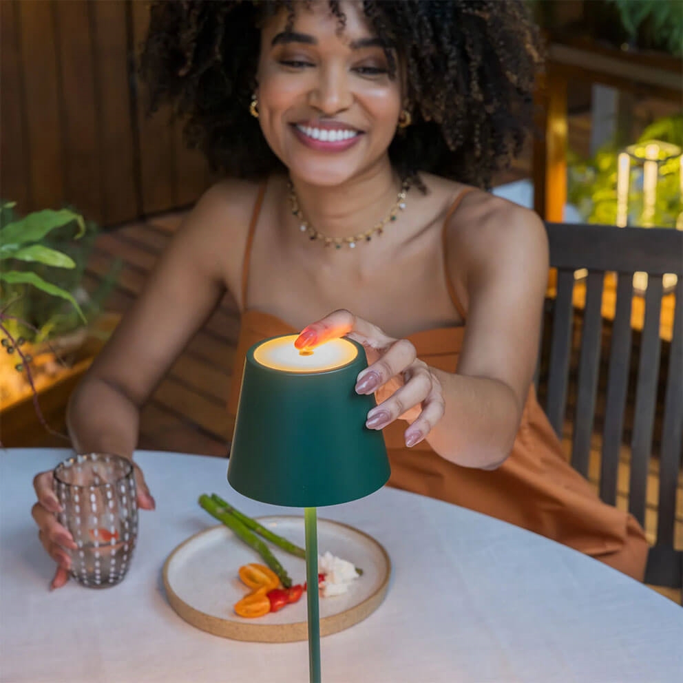 De tafellamp is gemakkelijk mee te nemen en kan via een touch-functie bovenop de kap worden gedimd, zodat het licht past bij de gewenste sfeer. De kleurtemperatuur van 2200K, 2700K of 3000K kan ook met de touch-functie worden gekozen en wordt onthouden door een geheugenfunctie.
