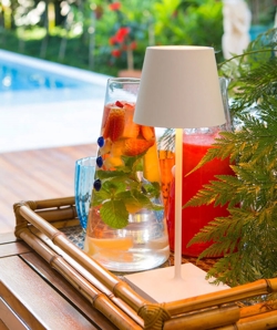 De lampenserie Poldina omvat onder andere tafellampen, vloerlampen en hanglampen met oplaadbare batterij.