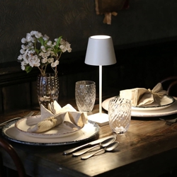 De oplaadbare tafellamp kan tot 12 uur branden op volle sterkte en wordt opgeladen op de meegeleverde laadbasis. Een volledige oplading duurt ongeveer 6-7 uur.