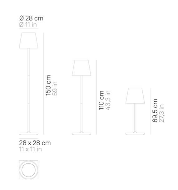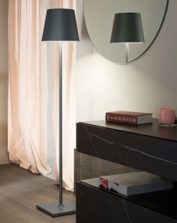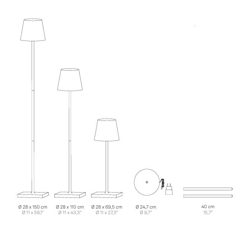 De draadloze Poldina XXL vloerlamp kan dankzij zijn IP54-classificatie zowel binnen als buiten worden gebruikt. De batterijlamp is oplaadbaar en heeft een stijlvol en eenvoudig ontwerp met een klassieke lampenkap op een slanke lampensteel met een discrete basis.