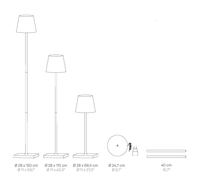 Poldina XXL is gemaakt van gegoten aluminium en is verkrijgbaar in meerdere kleuren. De oplaadbare vloerlamp kan tot 15 uur branden op volle sterkte en wordt opgeladen op de meegeleverde laadbasis. Een volledige oplading duurt ongeveer 20 uur en moet binnenshuis plaatsvinden.