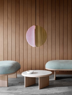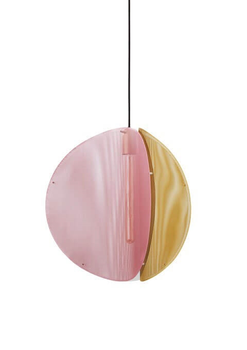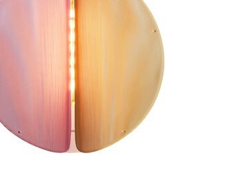 De hanglamp Proxima is geïnspireerd door de verre gloed van onze dichtstbijzijnde buurster Proxima Centauri. De lamp heeft een driekleurig ontwerp in staal met een afwerking in messing, asgrijs en jaipur lichtrood met honderden kleine perforaties, zodat het licht zacht in alle richtingen verspreidt.