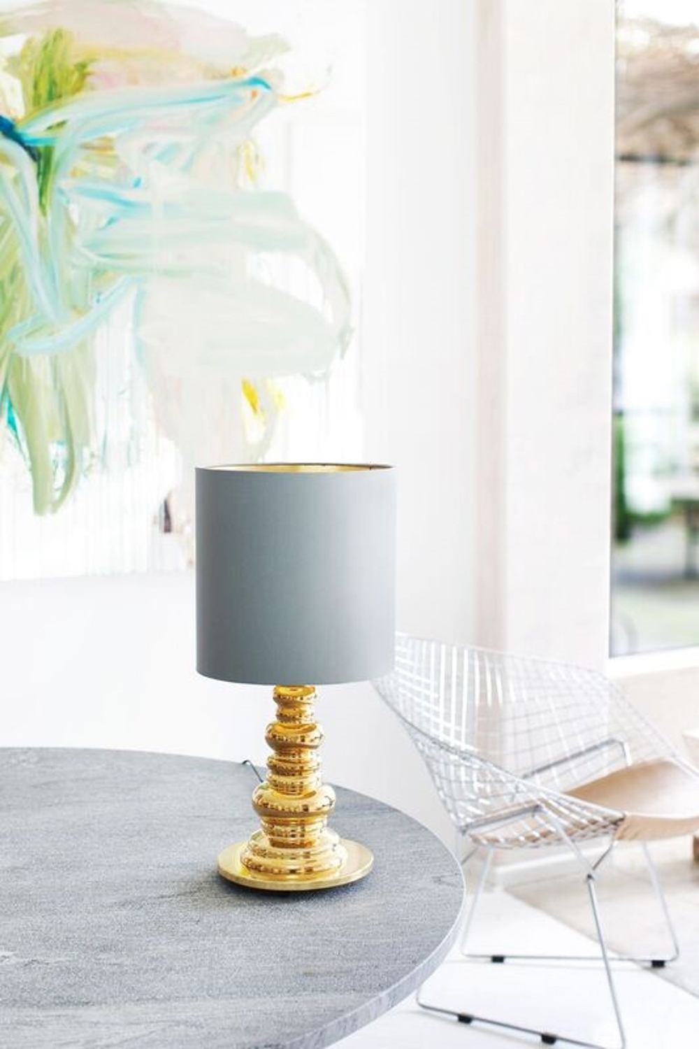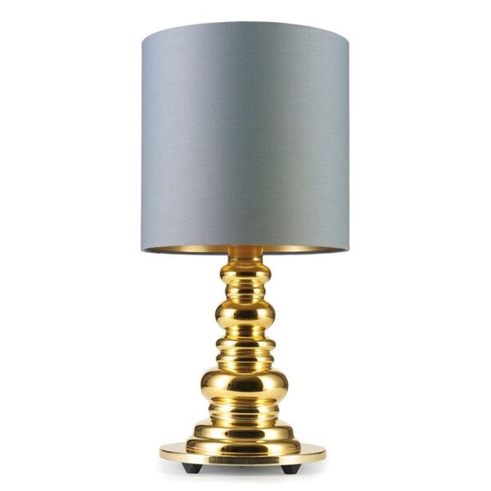Mondgeblazen en handgeschilderd glas in goud vormt de basis voor deze tafellamp. De kap is handgemaakt en heeft een gouden binnenkap.