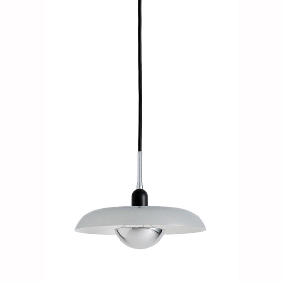 RA is verkrijgbaar in twee maten als hanglamp en tafellamp in wit, zwart en chroom.