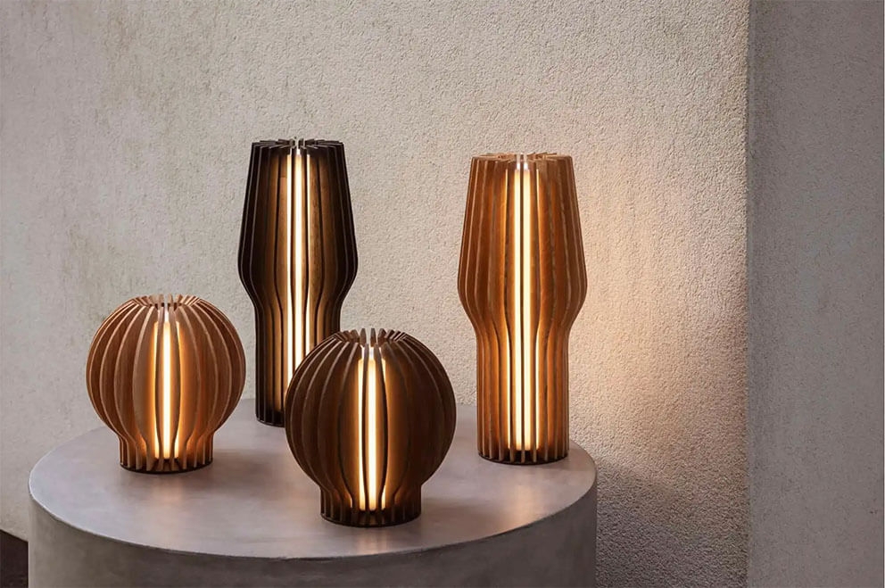 Radiant tafellamp is oplaadbaar en heeft een sculpturaal en decoratief ontwerp.
