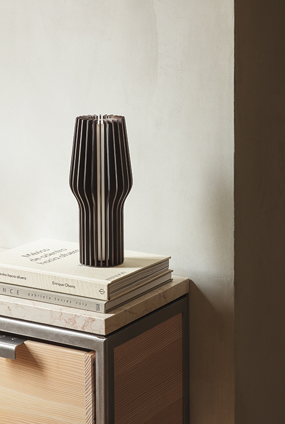 Radiant tafellamp is oplaadbaar en heeft een sculpturaal en decoratief ontwerp.