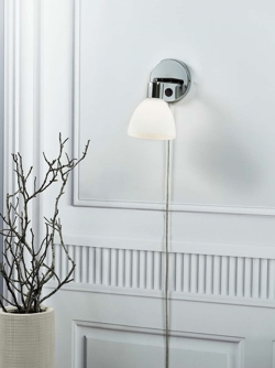 Ray wandlamp is ontworpen in een klassiek en elegant design, waarbij de combinatie van chroom en de witte glazen kap een stijlvol uiterlijk creëert. De mondgeblazen glazen kappen verspreiden een zacht en aangenaam licht, dat in veel ruimtes past – of je nu discrete sfeerverlichting in een hoek wilt of een praktische leeslamp bij de fauteuil, het bed of in de tienerkamer.