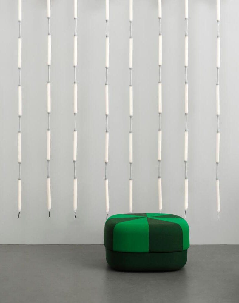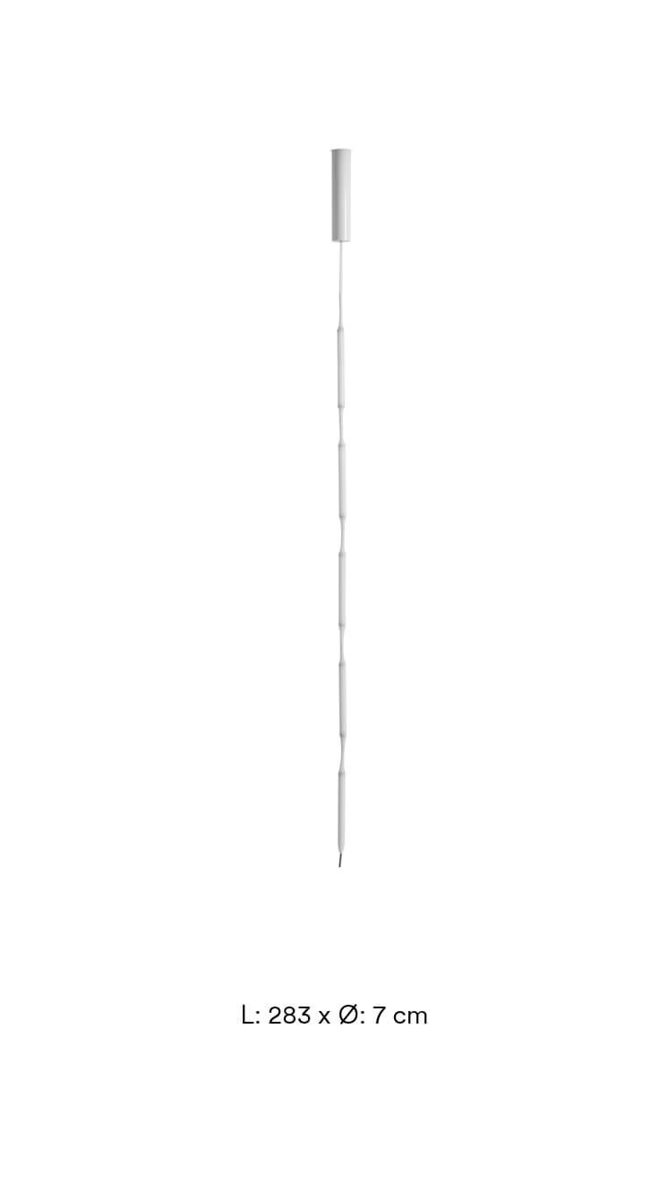 Reb lamp 5 is een onconventionele hanglamp, samengesteld uit vijf LED-modules bekleed met een witte meshbuis van PET. De lamp hangt aan het plafond als een verlicht touw en is flexibel, zodat hij alleen of samen met meerdere creatief kan worden gerangschikt als een sculpturaal element in de ruimte of naast elkaar kan hangen als ruimteverdeler of lichtgordijn.