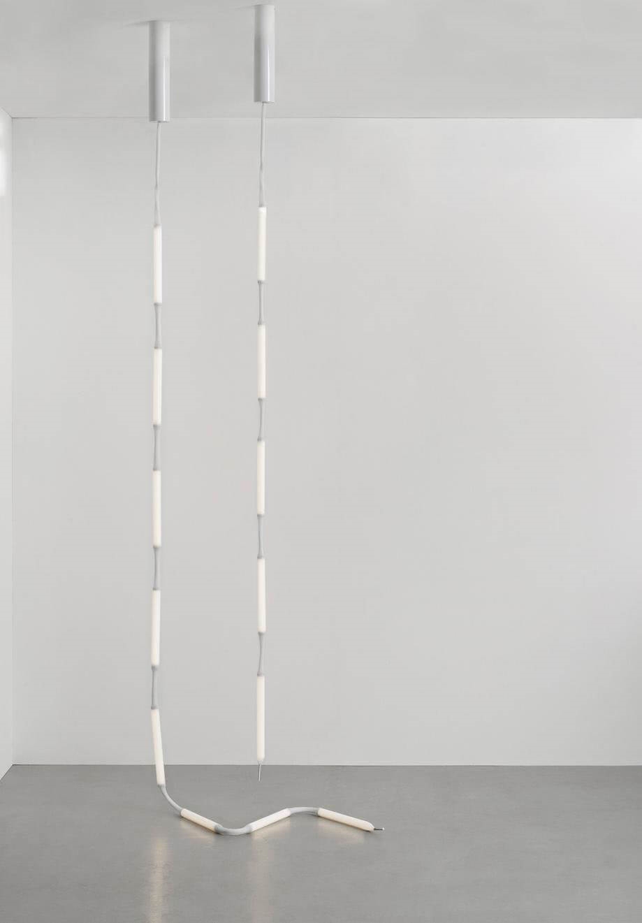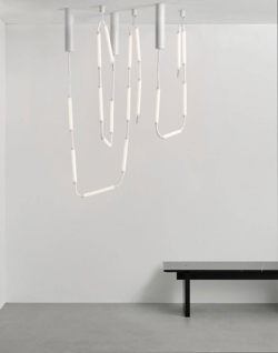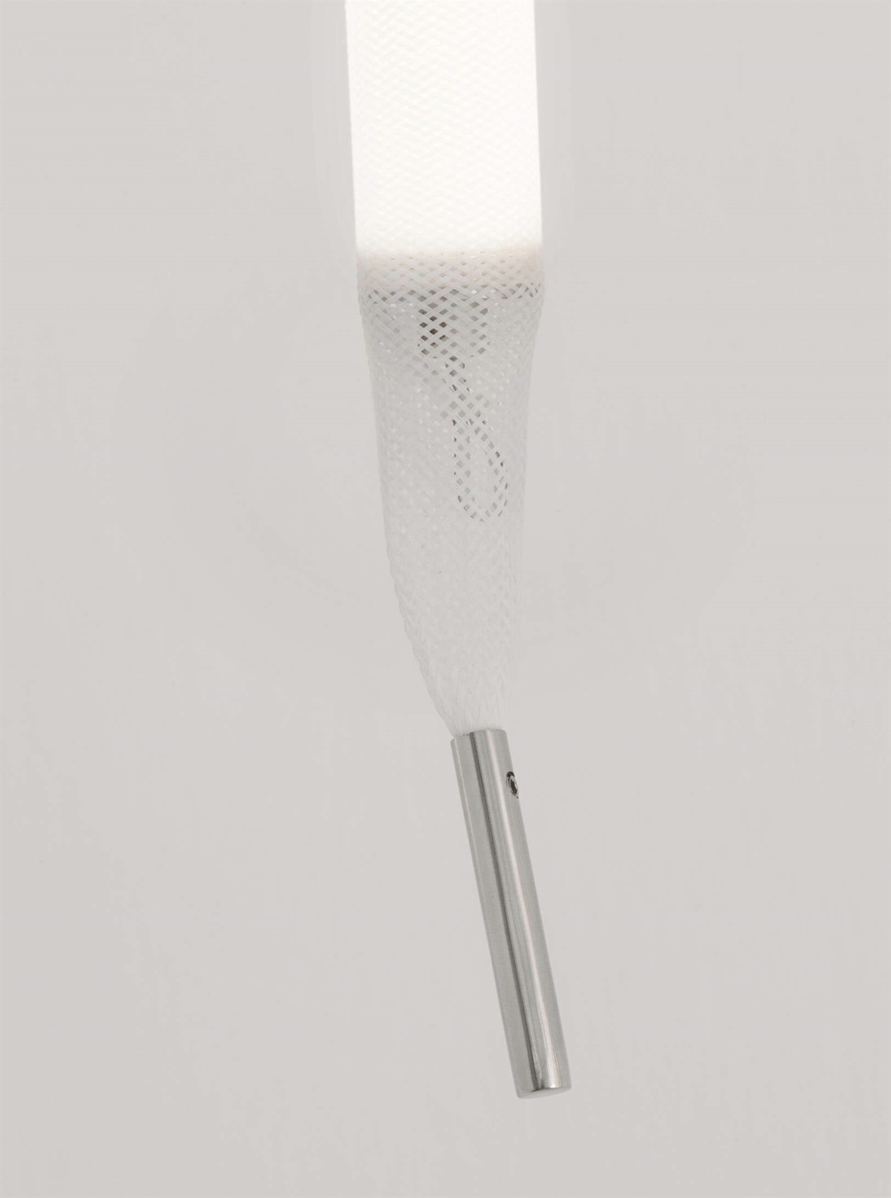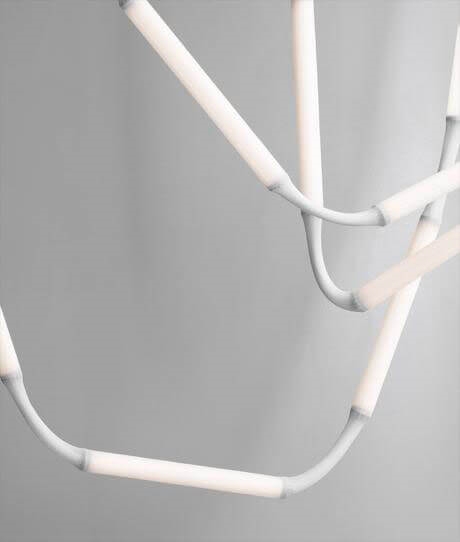 Reb lamp 8 is een onconventionele hanglamp, samengesteld uit acht LED-modules bekleed met een witte meshbuis van PET. De lamp hangt aan het plafond als een verlicht touw en is flexibel, zodat hij alleen of samen met meerdere creatief kan worden gerangschikt als een sculpturaal element in de ruimte of naast elkaar kan worden gehangen en kan fungeren als ruimteverdeler of lichtgordijn.