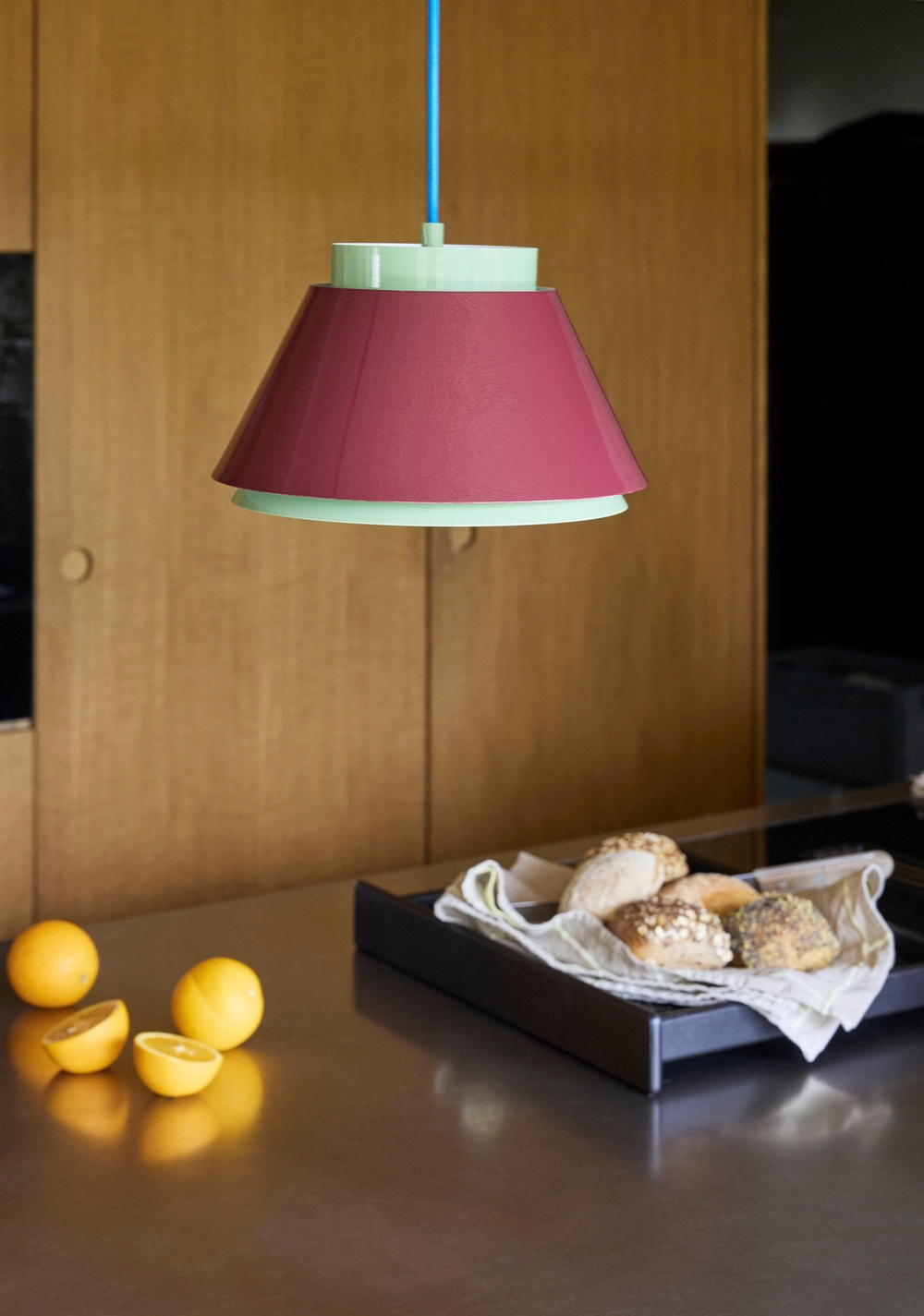 De kleuren creëren een retro-uitstraling geïnspireerd op de jaren 60 en geven de ruimte een nostalgische sfeer. De eenvoudige, afgeronde en compacte vorm maakt de hanglamp ideaal solo of met meerdere samen boven de eettafel en het kookeiland, of in een hoek van de woonkamer waar je de focus wilt leggen op zowel licht als design.