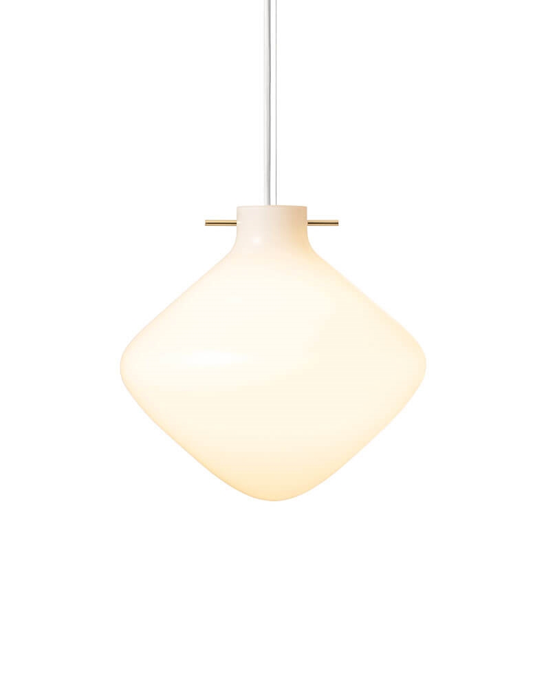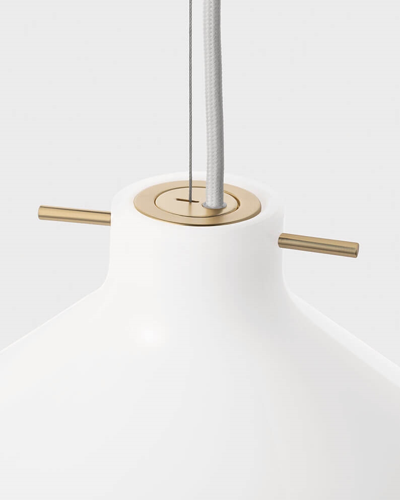 De hanglamp Repose in glanzend mondgeblazen opaalglas heeft een lichtheid in het ontwerp, waarbij een karakteristieke messing staaf de kap zwevend in de lucht houdt. De messing staaf is geïnspireerd op traditionele Japanse haarspelden, die ondanks hun eenvoudige vormgeving een grote functionaliteit hebben.