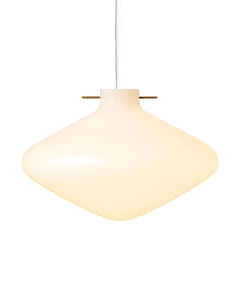 De hanglamp Repose in glanzend mondgeblazen opaalglas heeft een lichtheid in het ontwerp, waarbij een karakteristieke messing staaf de kap zwevend in de lucht houdt. De messing staaf is geïnspireerd op traditionele Japanse haarspelden, die ondanks hun eenvoudige vormgeving een grote functionaliteit hebben.