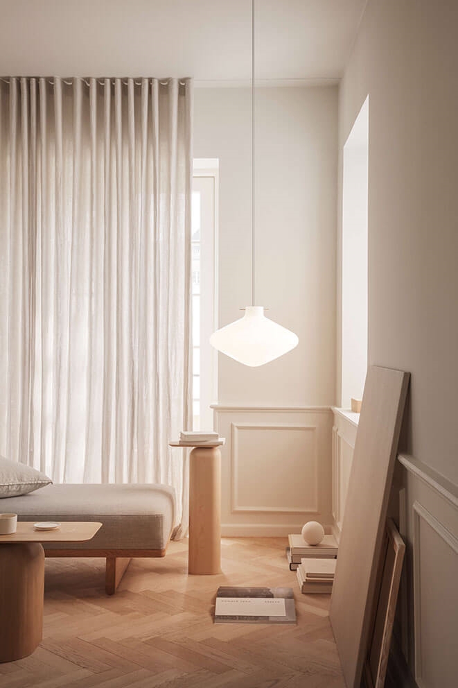 De opalen kap met drielaags glas zorgt voor een gelijkmatige en aangename verlichting en draagt met zijn zachte organische vorm bij aan het creëren van een rustige sfeer in de ruimte.