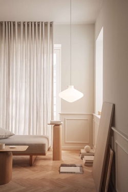 De Repose-serie is gecreëerd door het Deens-Italiaanse designstudio GamFratesi en bestaat uit hanglampen in verschillende maten, evenals een tafellamp en een wandlamp.
