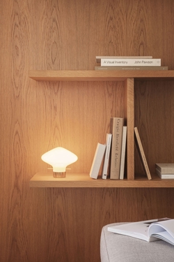 De tafellamp Repose in glanzend mondgeblazen opaalglas heeft een lichtheid in het ontwerp, waarbij een karakteristieke pin van messing de kap ondersteunt. De messing pin is geïnspireerd op traditionele Japanse haarspelden, die ondanks hun eenvoudige vormgeving een grote functionaliteit hebben.
