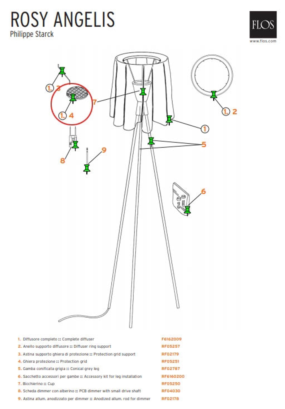 Reserveonderdeel: Beschermrooster voor Flos Rosy Angelis vloerlamp ontworpen door Philippe Starck.