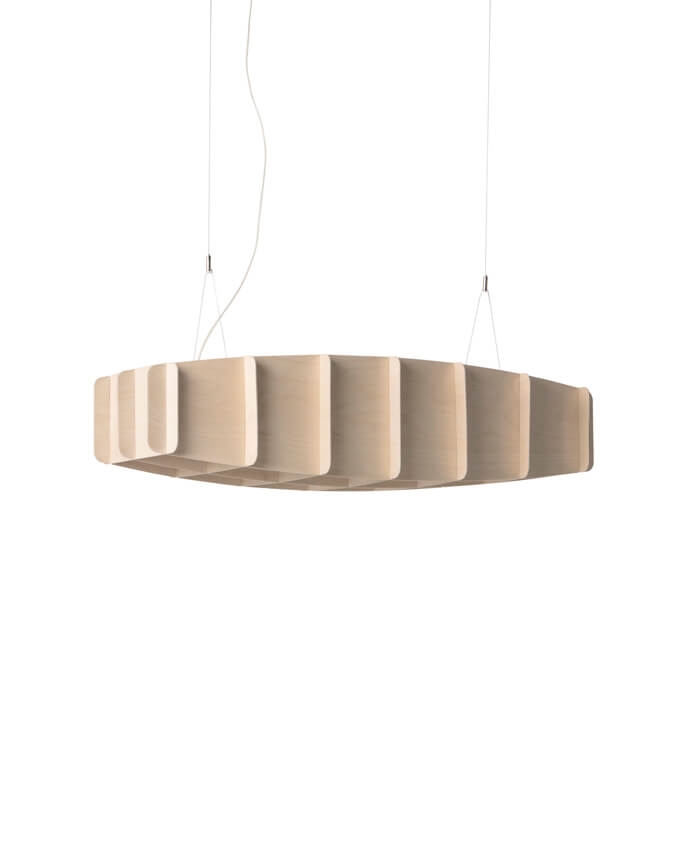 De lamp is gemaakt van duurzaam gecertificeerd berkenmultiplex, handgemaakt in Finland en gemonteerd zonder schroeven of lijm.