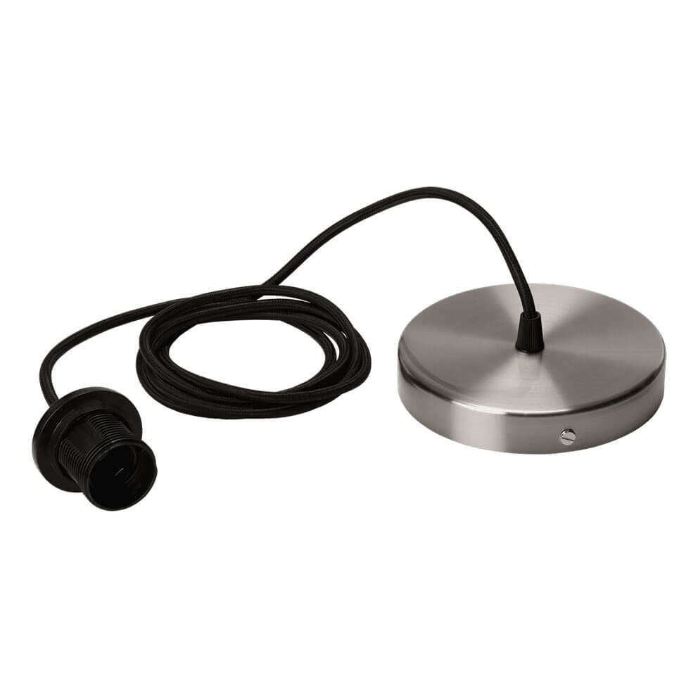 Minimalistische en functionele lampophanging met E27-fitting, baldakijn/rozet in metaal en 2,1 meter stoffen snoer. Rosette is verkrijgbaar in wit, zwart, messing of geborsteld staal en kan onder andere worden gebruikt met Umage lampenkappen: