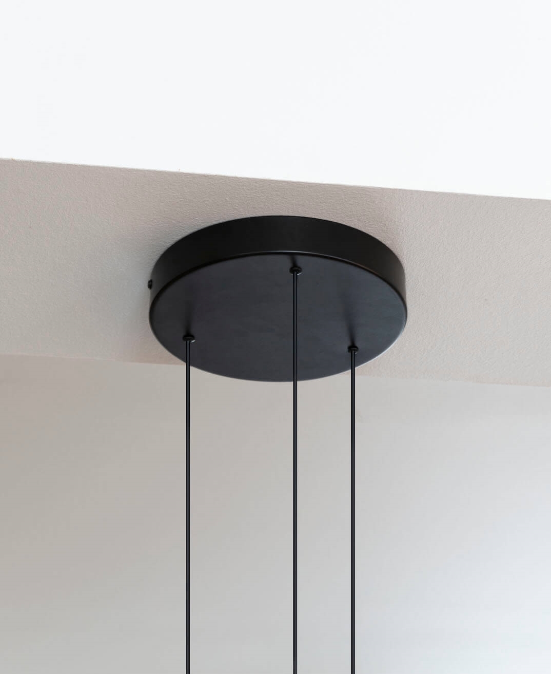 Minimalistische en functionele clusterophanging met drie G4-fittingen en diffuserkappen, baldakijn van metaal en 3 meter snoer. Kan onder andere worden gebruikt met de lampenkappen Eos nano van Umage.