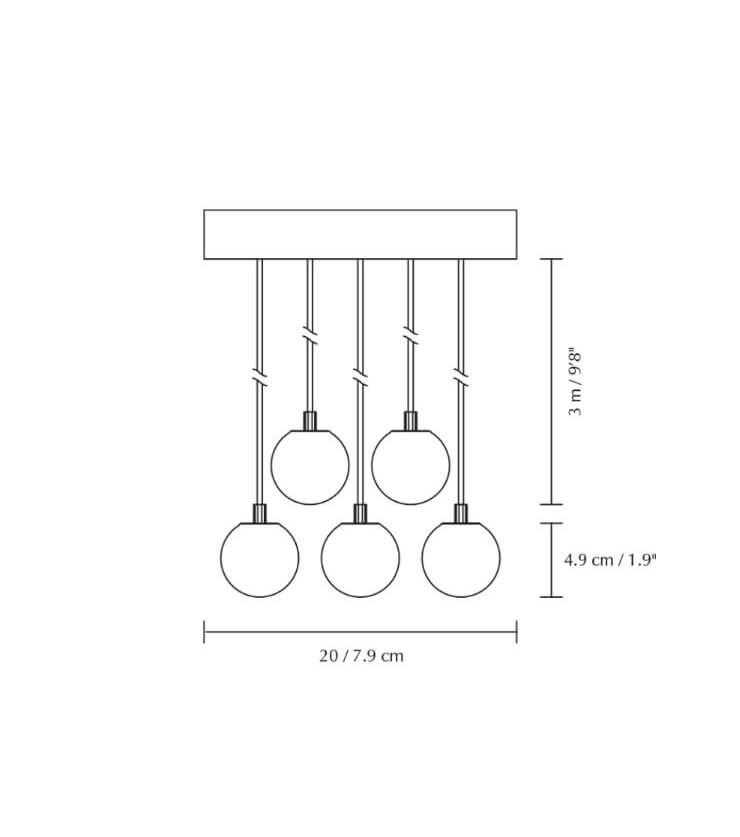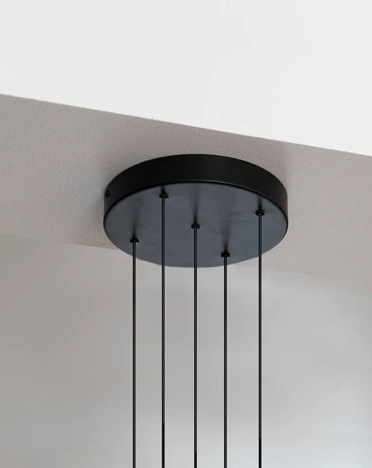 Minimalistische en functionele clusterophanging met vijf G4-fittingen en diffuserkappen, baldakijn van metaal en 3 meter snoer. Kan onder andere worden gebruikt met de lampenkappen Eos nano van Umage.