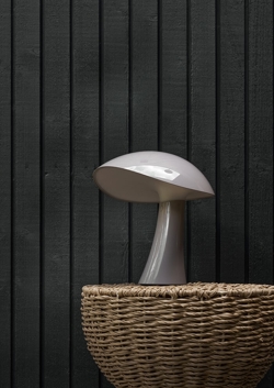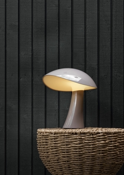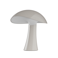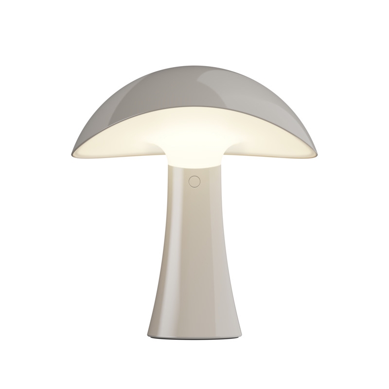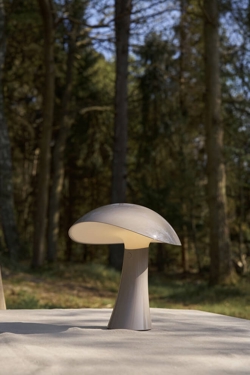 De batterijlamp Rumee in grijs heeft een modern en functioneel ontwerp met een zachte sculpturale vorm geïnspireerd door de golvende rondingen van een ruime en brede hoed. De naam speelt in op het geluid van roomie - de informele term voor een huisgenoot - en roept een gevoel van huiselijkheid, warmte en veiligheid op.
