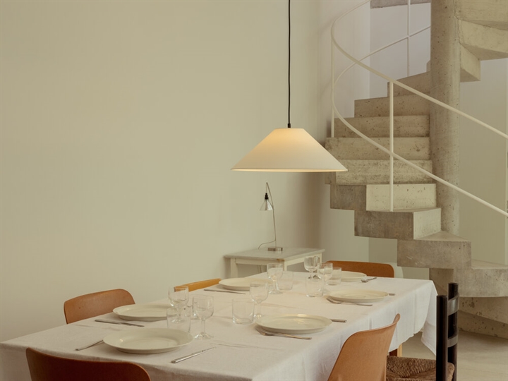 Ontworpen als een eerbetoon aan karton en zijn warme, diffuse licht, creëert deze lampenkap een gezellige sfeer – perfect voor lange gesprekken aan tafel. Kies uit twee varianten van genaaid karton, beige of wit, die beide harmonieus samengaan met het interieur.