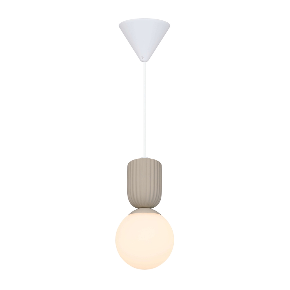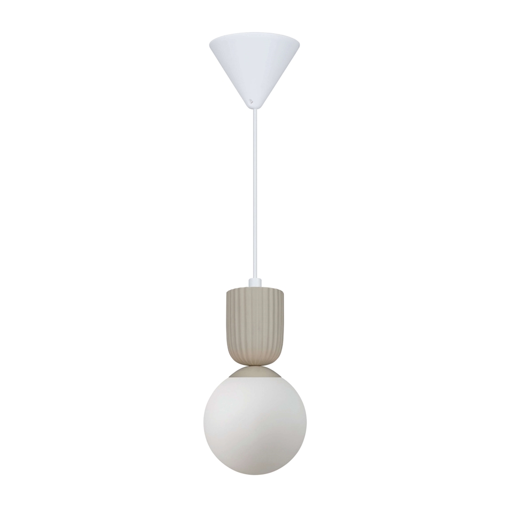 De hanglamp Sadie heeft een prachtig design met een mix van opaalglas en geribbeld keramiek. De lamp levert een aangenaam en verblindingsvrij licht vanuit de mondgeblazen kap in opaalglas, die karakter en een levendig uiterlijk krijgt door de handmatige productie en kan variëren in expressie en dikte.