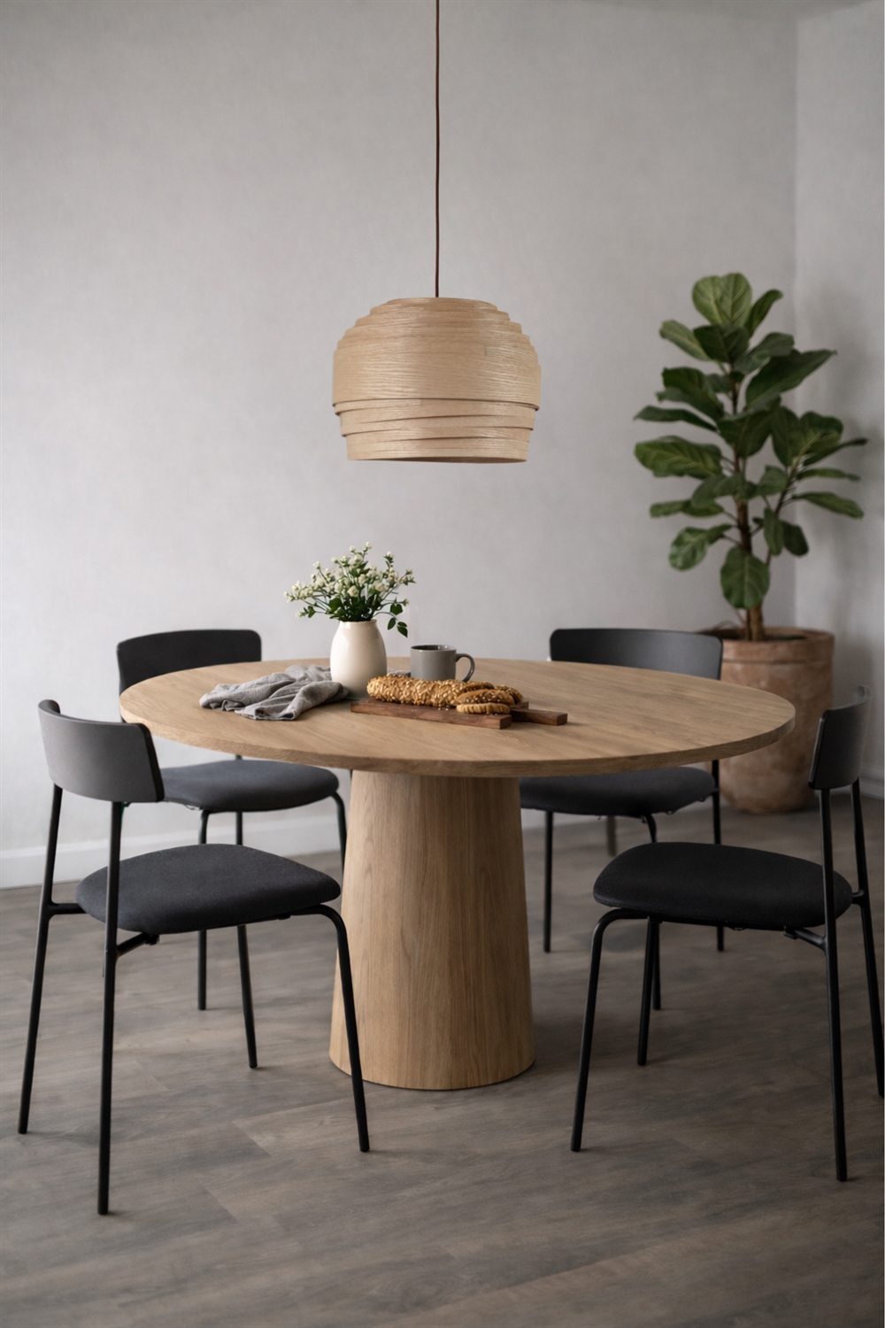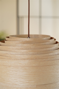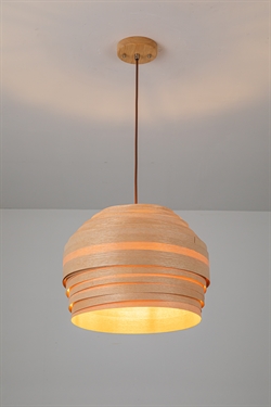 Het ontwerp is geïnspireerd op de ringen van de planeten en opgebouwd uit dunne, gelaagde houten lamellen. Deze constructie zorgt voor een karakteristiek spel tussen licht en schaduw, waarbij het licht zacht de ruimte in wordt gefilterd en een rustige, atmosferische verlichting creëert. Tegelijkertijd is de onderzijde open, wat zorgt voor een meer direct en functioneel licht naar beneden.