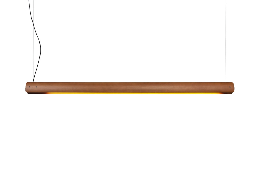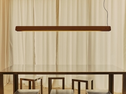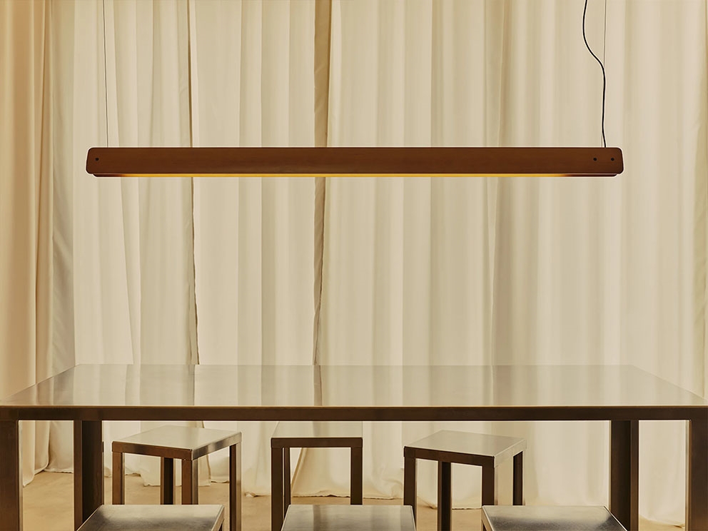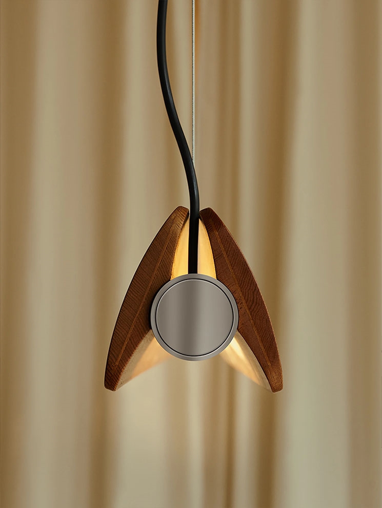 De hanglamp Seki-Han heeft een sculpturaal ontwerp met twee horizontale bladen van esdoornhout, verbonden door verchroomde metalen beslag. De houten bladen kunnen draaien rond de buisvormige lichtbron van de lamp en zorgen voor variatie in de lichtverdeling.
