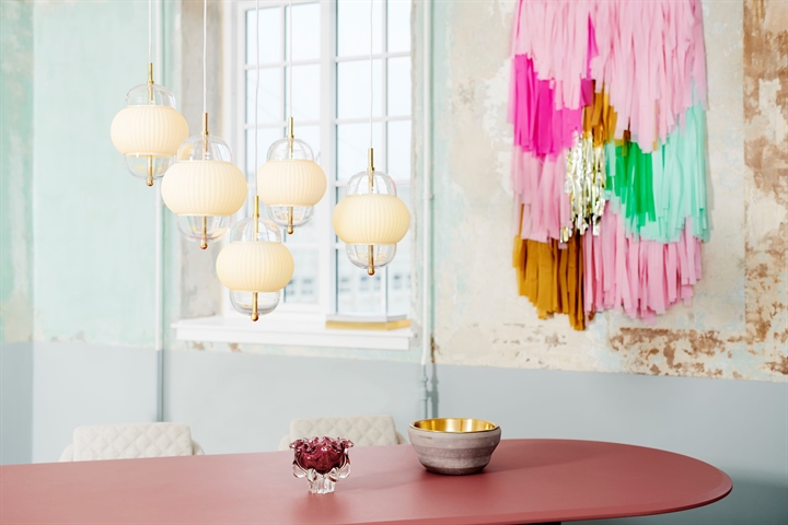 Shahin is een ongelooflijk elegante hanglamp met prachtige details in messing, bestaande uit twee glazen kappen en een mooi wit opaalglas in het midden.