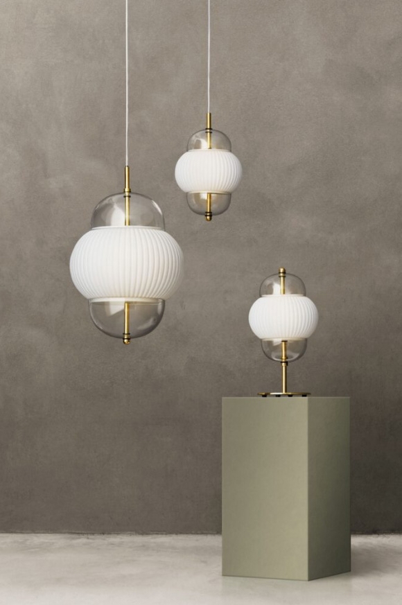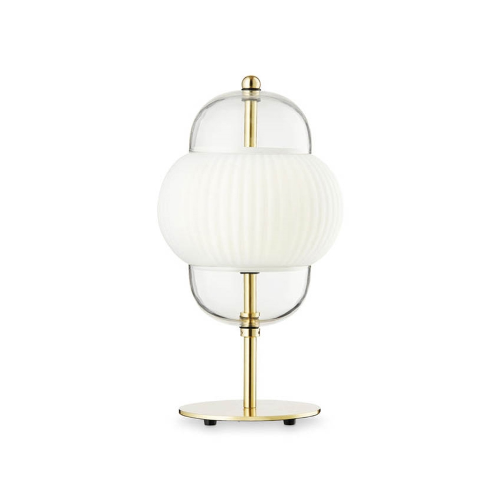Shahin is een ongelooflijk elegante tafellamp met prachtige messing details, bestaande uit twee glazen kappen en een mooi wit opaalglas in het midden.