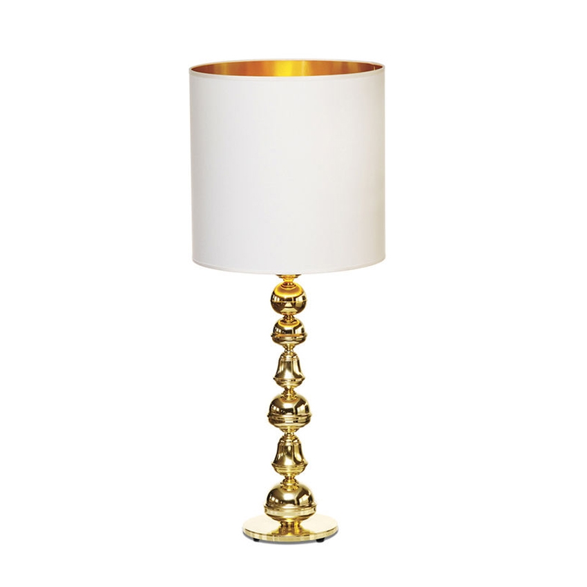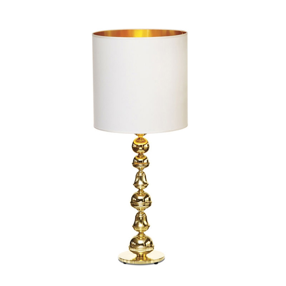 De lampenkap is een handgemaakte witte stoffen kap met een gouden binnenkant.