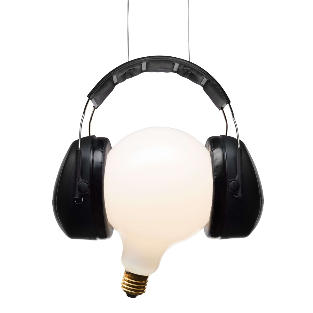 Op het eerste gezicht lijkt Shhh! een klassieke gloeilamp te zijn omarmd door een set grote hoofdtelefoons, waar het licht een vredig moment zoekt weg van het lawaai van de wereld. De verrassing zit in het detail: De lichtbronnen verbergen zich in de hoofdtelefoons, vanwaar het licht zacht en diffuus door het glas wordt verspreid en een warme, uitnodigende gloed creëert. De twee geïntegreerde spots in het onderste deel van de hoofdtelefoons leveren gericht neerwaarts licht, perfect om oppervlakken zoals tafels, werkruimtes of kunstwerken te accentueren.