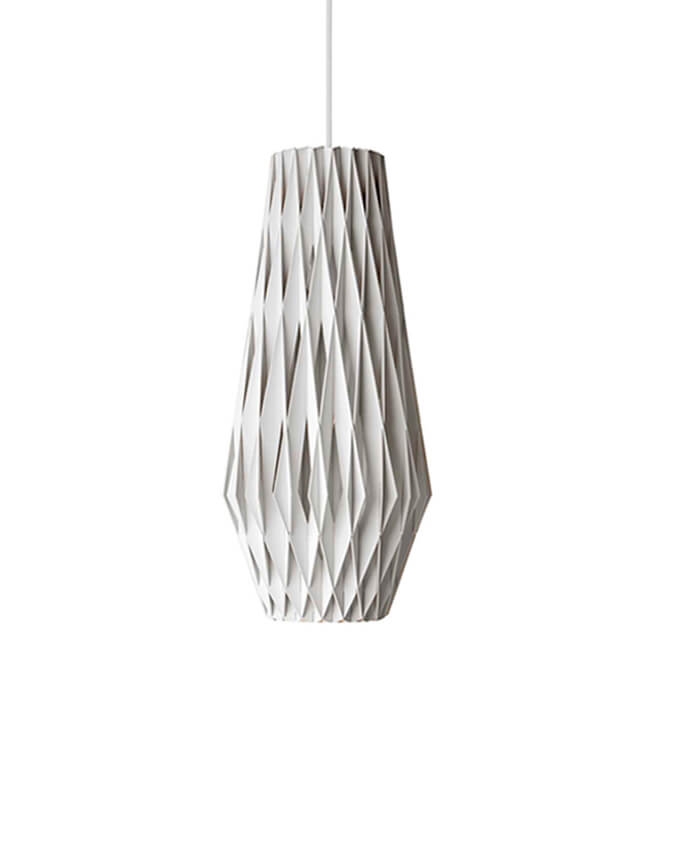 De hanglamp heeft met zijn grote vorm een aanwezigheid in de ruimte en past zowel in privé- als openbare omgevingen. De lamp is gemaakt van natuurlijk en duurzaam hout, handgemaakt in Finland. Het hout creëert een warme sfeer wanneer het licht erdoorheen schijnt en is zonder schroeven of lijm gemonteerd. Daarnaast heeft de hanglamp een stijlvol en geometrisch ontwerp dat in elke ruimte de aandacht trekt. Ze zijn zowel mooi op zichzelf als in clusters te combineren.