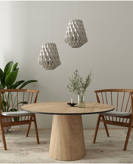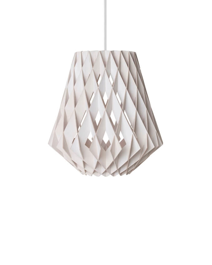 De hanglamp heeft met zijn grote vorm een aanwezigheid in de ruimte en past zowel in privé- als openbare omgevingen. De hanglamp is gemaakt van duurzaam gecertificeerd berkenmultiplex, dat met de hand is vervaardigd. De berkenlamellen creëren een warme sfeer wanneer het licht erdoorheen schijnt en zijn zonder schroeven of lijm gemonteerd. Bovendien heeft de hanglamp een stijlvol en geometrisch ontwerp dat in elke ruimte de aandacht trekt.