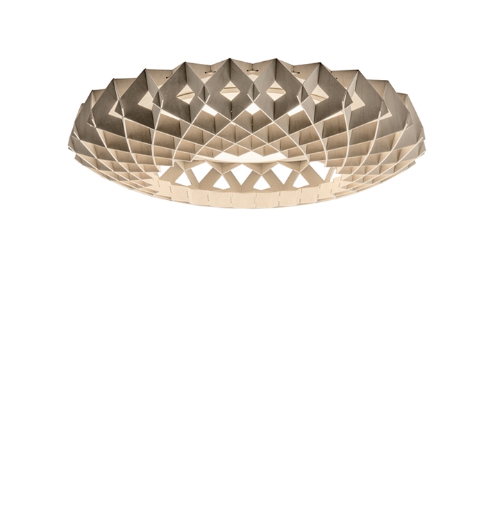 Deze prachtige lamp kan zowel als wandlamp als plafondlamp worden gebruikt in de hal, woonkamer of slaapkamer. De lamp is een echte blikvanger en heeft een mooi ontwerp. Hij is gemaakt van duurzaam gecertificeerd berkenmultiplex, dat met de hand is vervaardigd. De berkenlamellen creëren een warme sfeer wanneer het licht erdoorheen schijnt en zijn zonder schroeven of lijm gemonteerd. Daarnaast heeft de lamp een stijlvol en geometrisch design dat in elke ruimte de aandacht trekt.