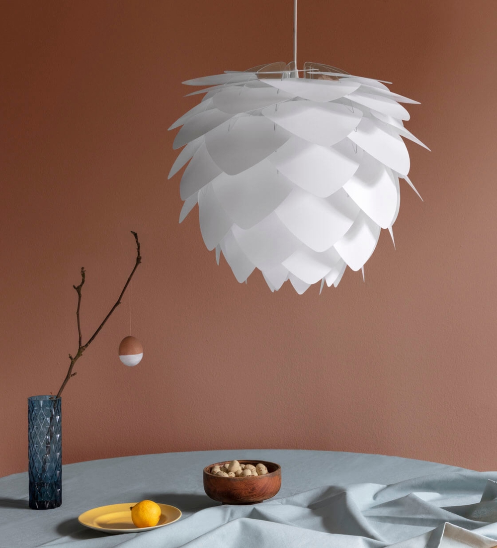 Silvia lampenkap heeft een karakteristiek ontwerp met driehoekige lamellen. De kap kan in combinatie met ophangsystemen of standaards van bijvoorbeeld Umage een prachtige hanglamp, wandlamp, vloerlamp of tafellamp vormen. Gebruik Silvia voor mooie verlichting boven de eettafel met een moderne uitstraling, die ook goed tot zijn recht komt in andere ruimtes van het huis. De prachtige lampenkap is verkrijgbaar in verschillende kleuren en twee maten.