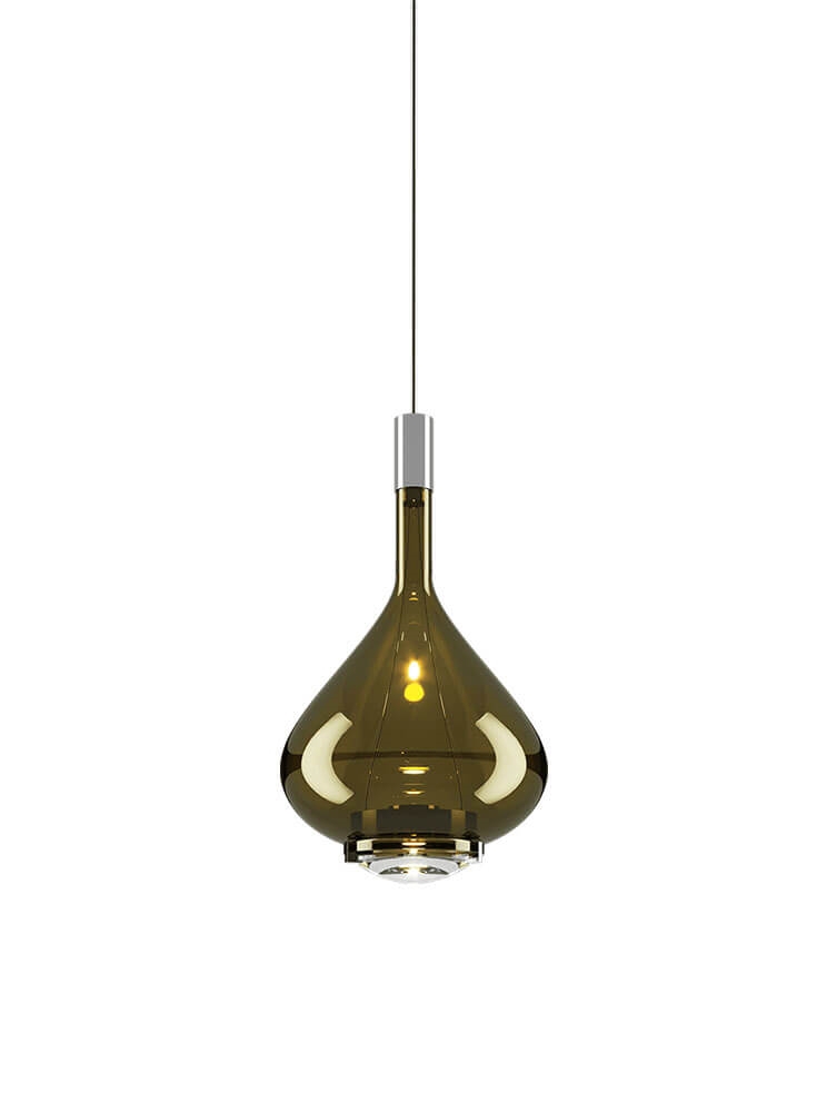 De Sky-Fall hanglamp in gouden saliegroen is het resultaat van een fusie tussen het ontwerp van een antieke wijnkaraf en nieuwe moderne lijnen. Het resultaat van deze fusie is een hanglamp met een prachtig en modern uiterlijk.