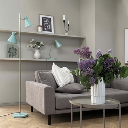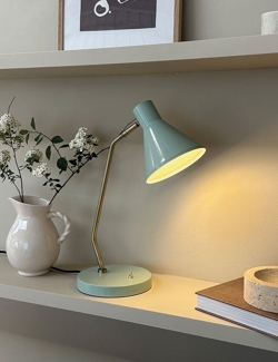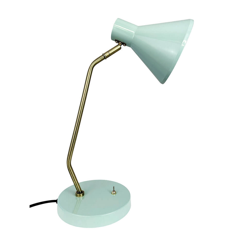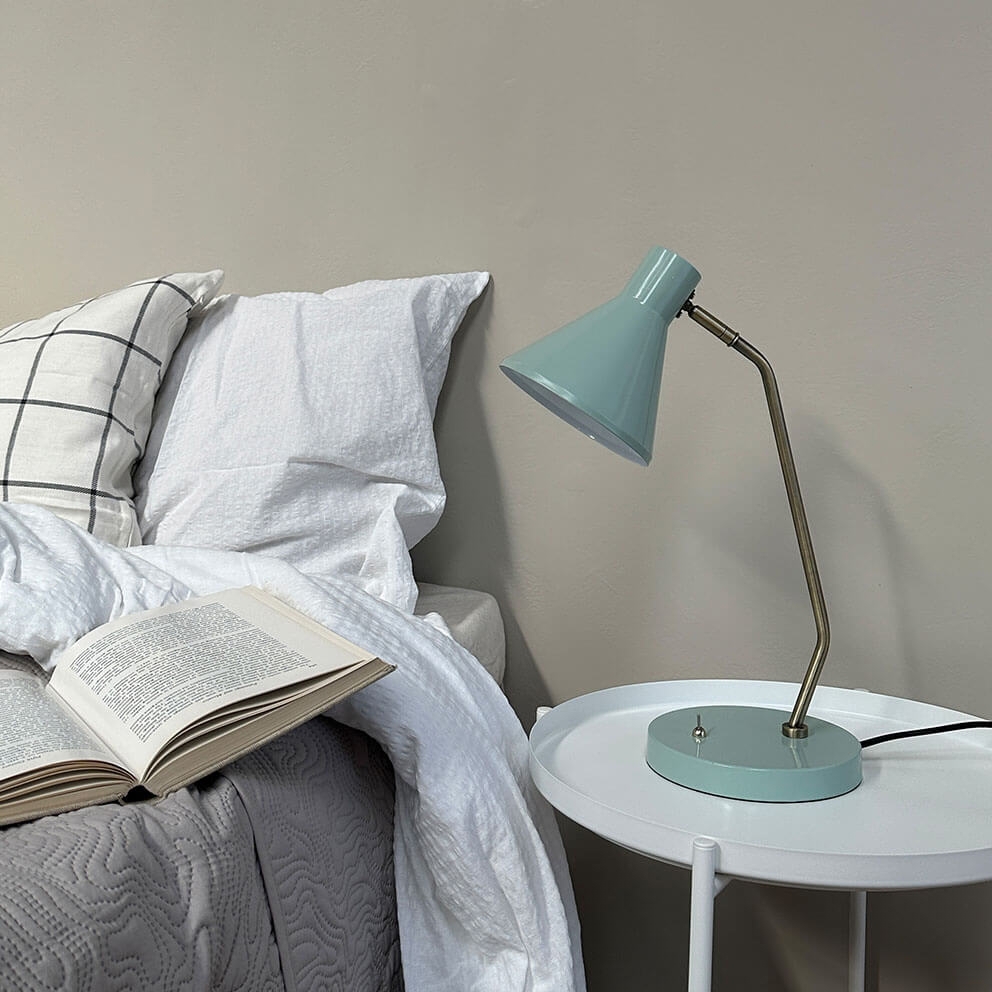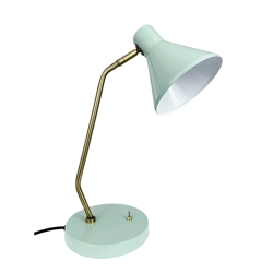 Sleep tafellamp is verkrijgbaar in de kleuren kit wit, mint en bruin. De serie bestaat ook uit een vloerlamp, wandlamp en klemlamp in dezelfde kleuren.