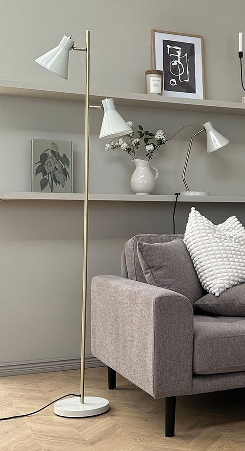 Sleep vloerlamp heeft een minimalistisch design en kan met zijn twee lichtbronnen onder andere gebruikt worden als leeslamp in de woonkamer of om een groter gebied in huis te verlichten. De twee elegante kappen kunnen worden gekanteld en gedraaid, zodat je zelf de richting van het licht kunt bepalen. De lichtbronnen worden in- en uitgeschakeld met schakelaars op de kappen, die zijn gemonteerd op de messing staaf.
