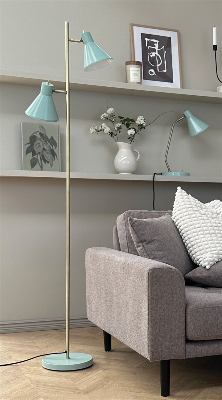 Sleep vloerlamp is verkrijgbaar in de kleuren kit wit, mint en bruin. De serie bestaat ook uit een tafellamp, wandlamp en klemlamp in dezelfde kleuren.