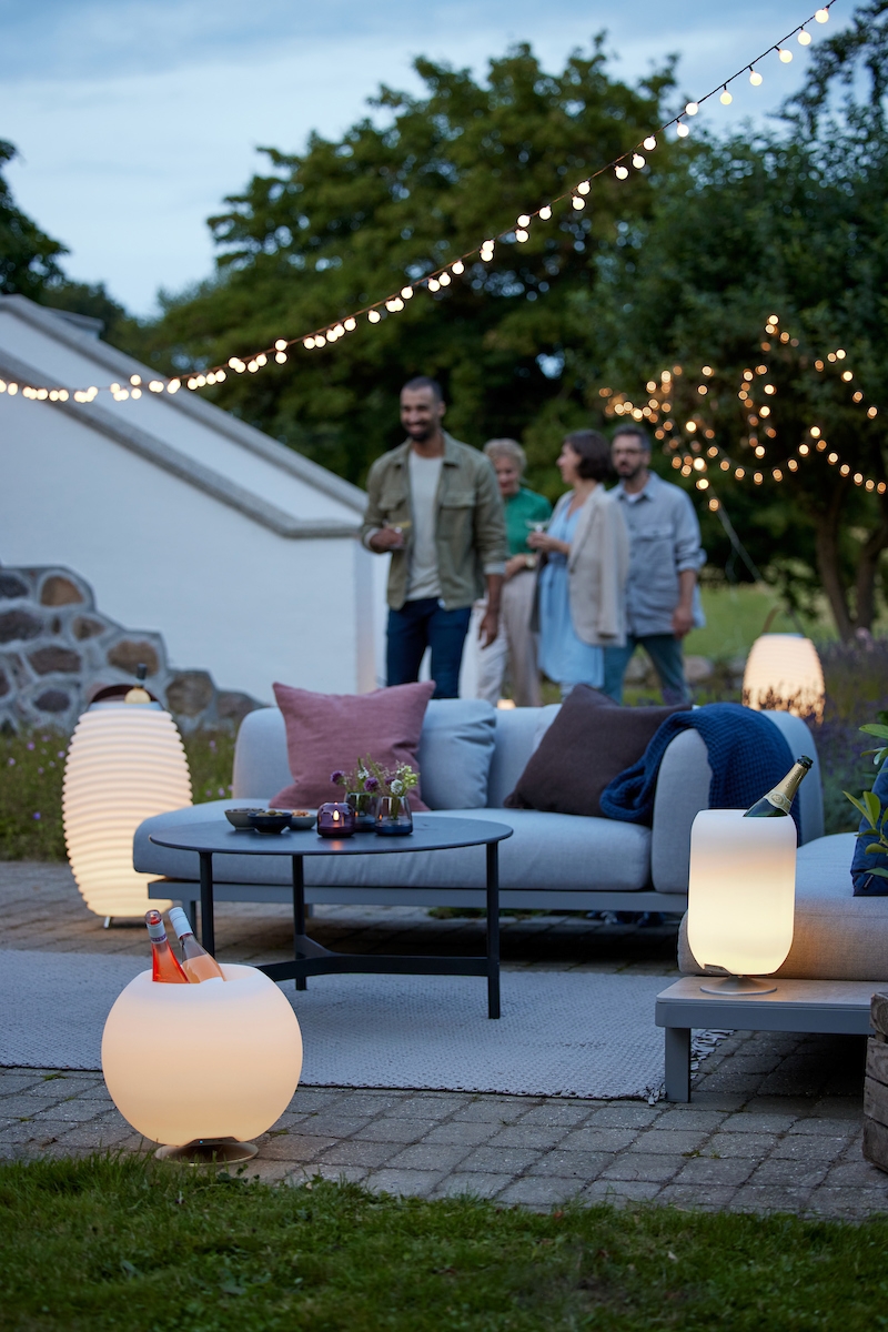 Kooduu Sphere LED batterijlamp met ingebouwde speaker en drankkoeler in geborsteld zilver - ontworpen door Jacob Jensen Design.